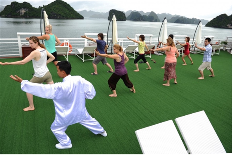 6:30 Early morning sun risers can enjoy Tai Chi le session on the sundeck. Tai chi also called Tai chi chuan, combines deep breathing and relaxation with slow and gentle movements. Coffee, tea and pastries for light breakfast are served in the dining room with morning view of bay’s landscape.