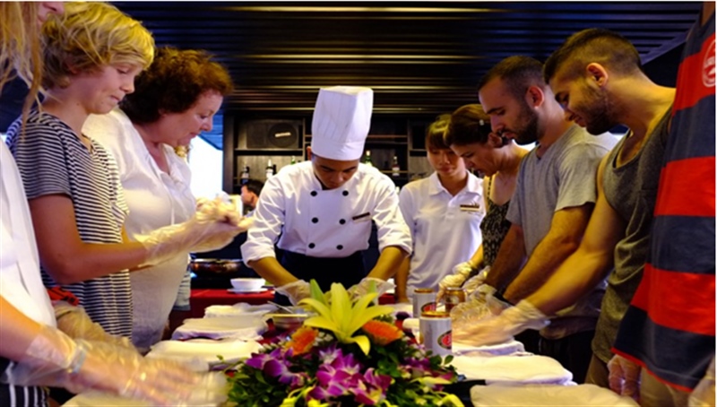 18:00- 18: 30 Join the cooking class guided directly by Chef of Alisa Cruise. You have chance to practice Vietnamese traditional dishes such as spring roll or famous cuisine of Vietnam.